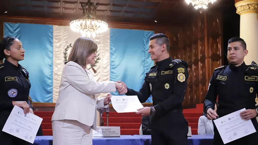 La vicepresidenta de la República, Karin Herrera asistió junto a la Secretaría Contra la Adicción y el Tráfico Ilícito de Drogas (SECCATID), a la clausura del Diplomado en Prevención del Consumo de Drogas en el que participaron 128 agentes de la Policía Nacional Civil (PNC) como parte del programa "mundo libre de drogas" dirigido a la Subdirección General de Análisis de Información Antinarcótica y la unidad aérea del Ministerio de Gobernación (MINGOB).